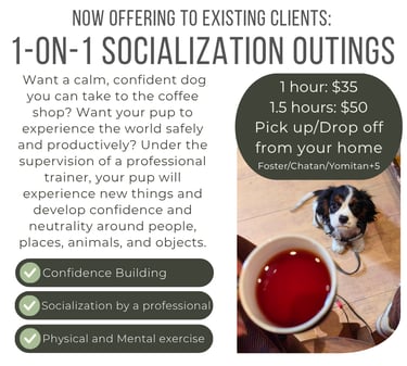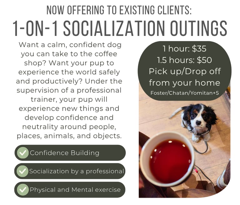 After I pick up your pup, we will visit a pet-friendly store or market, spend time outside a busy Exchange, sit outside of a dog park or at a coffee shop, and engage with new people, animals, and objects. Good socialization builds your dog’s confidence and creates neutral responses to new and novel things.